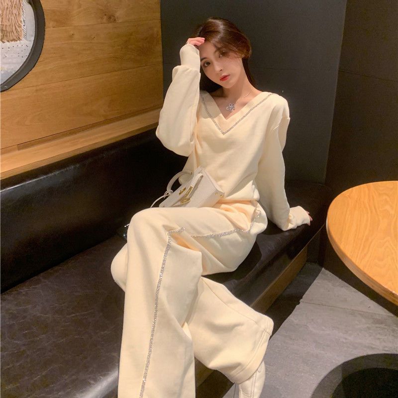 V-neck Slim Fit Slimming Sweatshirt Wide Leg Pants Casual Sports Sets